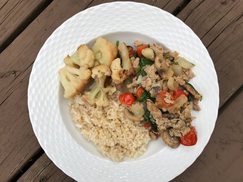 Oh so the thing about no-recipe meals is that I kind of make up the recipe name based on the ingredients I throw in the pan. Basically I cooked some ground chicken with mushrooms, onions, spinach, and cherry tomatoes. I added some garlic and Italian seasoning. And then paired the main with roasted cauliflower and brown rice. Manja!