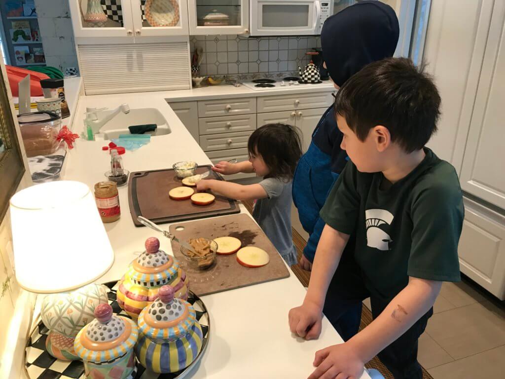 Really though, when you think of the letter A in school, apple is always an image associated with it in books and worksheets. And whether you verbalize big A or little a, making the A sound correctly is easy when you say the word “apple.” Or so that’s what our Nana taught us. So, while Nana is teaching sounds, Mom is teaching kitchen skills with apple donuts. We make a good team!