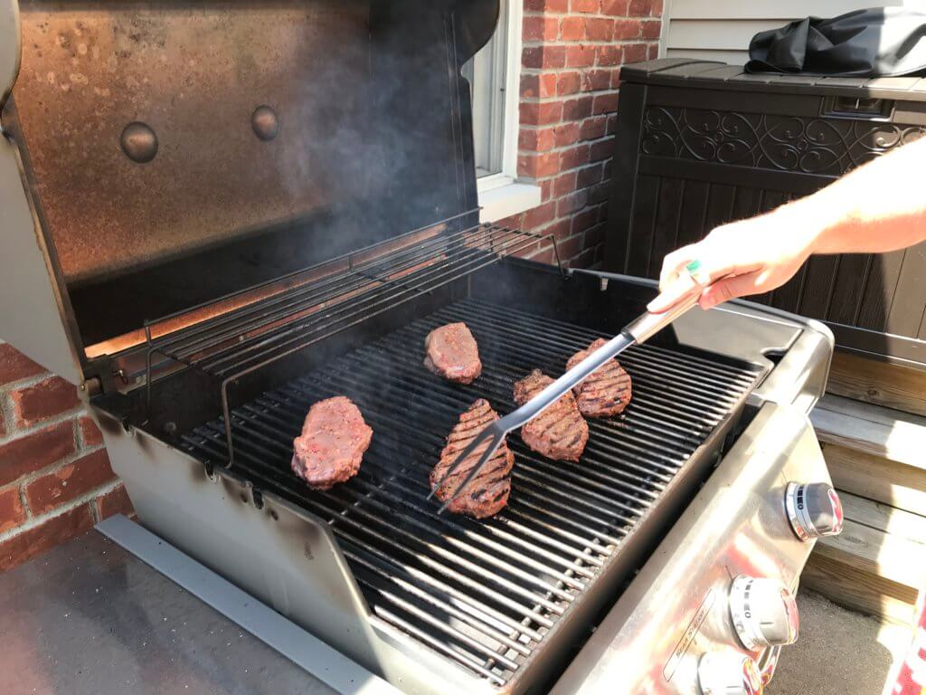 - Use a spatula to turn burgers and tongs to turn steaks and kabobs.