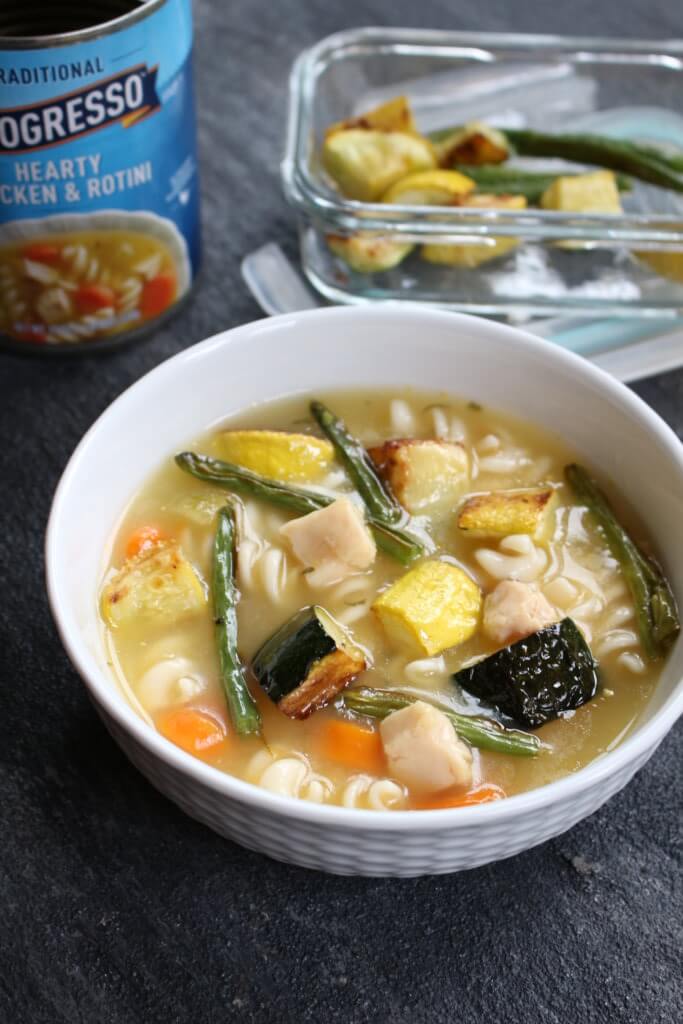 February is soup season, and what better way to get a warm bowl of deliciousness on the table fast by trying new soup varieties and recipes, like this leftover roasted vegetable chicken soup. The convenience of opening a can of ProgressoTM soup after a busy morning or afternoon helps me prep a meal in minutes when we walk through the door! And who wouldn’t want their kids to eat more veggies?! You can use this method of adding extra veggies to any one of Progresso’s chicken soups. Each of their chicken soups are made with 100% antibiotic and hormone free white meat chicken breasts, quality and flavor I feel good about feeding my family.