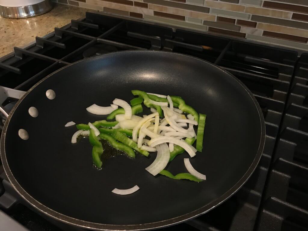 - Heat oven to 450. Meanwhile, add oil, onion, and pepper to large skillet. Sautee on medium-high until vegetables are soft, about 7-10 minutes.