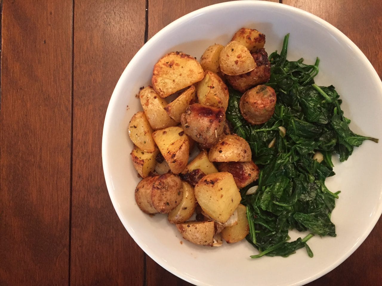 Now the sausage, potato, and onions are just a simple base. You can adapt this recipe to include other vegetables fit for roasting, such as peppers, sweet potatoes, squash, broccoli, etc. You can find my full-proof tips and tricks for roasting vegetables here. Even though the roasted sausage, potatoes, and onions make a meal, I like serving it alongside something bright and colorful, like spinach! So if you follow MY recipe pictured here, this will be a two-pan meal… it’s still worth it!