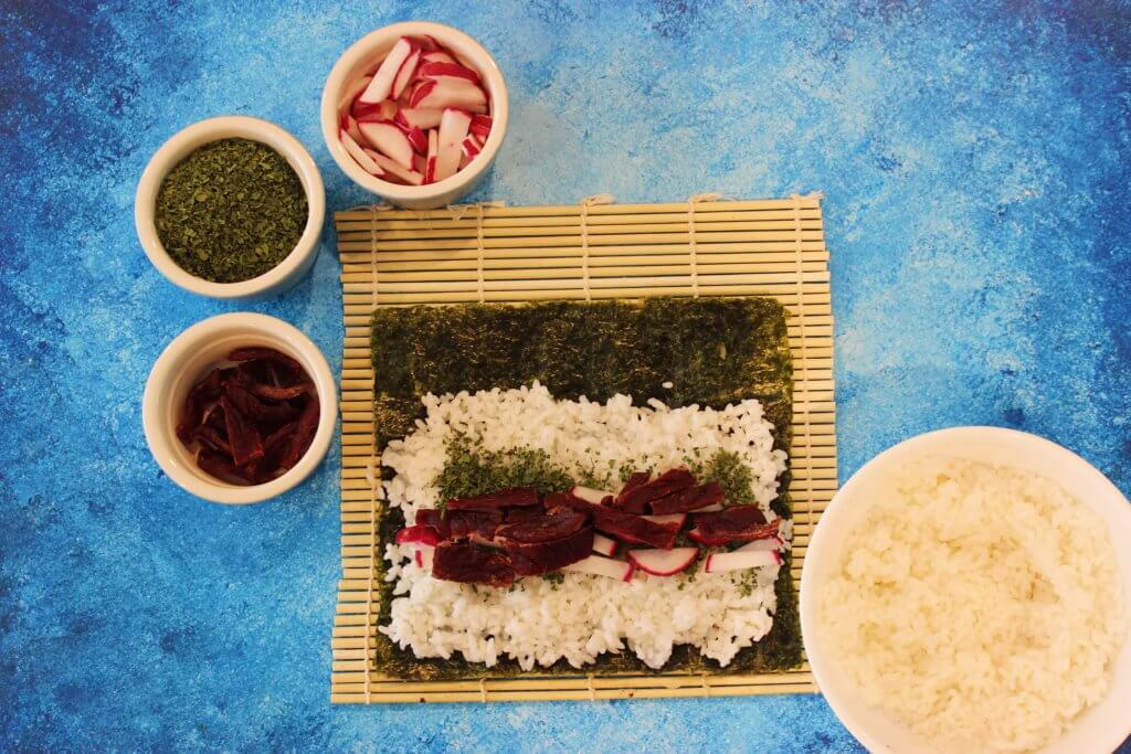 - Lay the cilantro, radishes and spicy jerky cross wide along the rice, covering half the surface closest to you