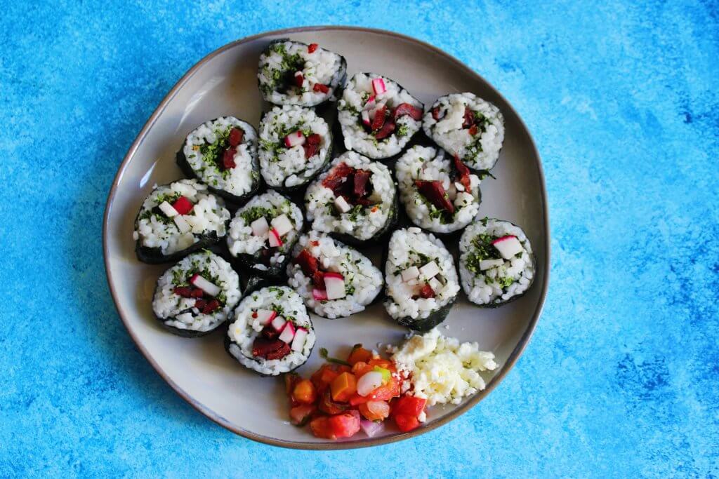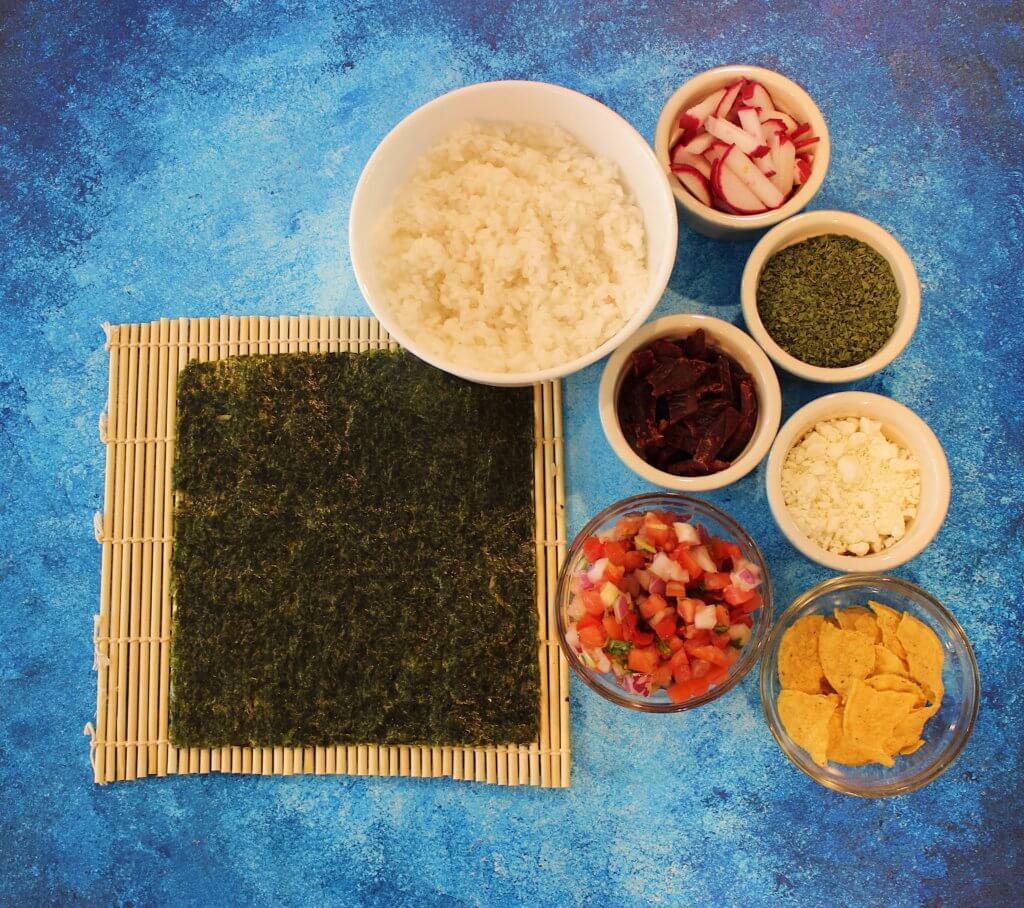 - Repeat with the remaining ingredients. Slice each roll into 8 rounds, arrange on a sushi platter, and garnish with the remaining tortilla strips, queso fresco and serve with Pico de Gallo.