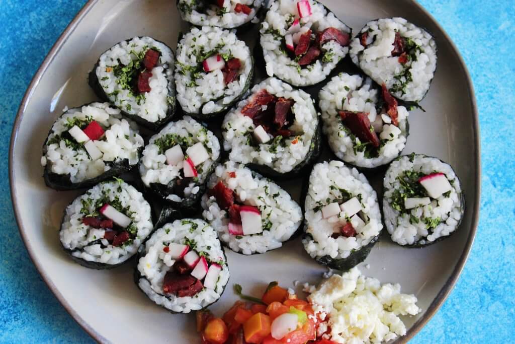 While you know I’m one for introducing my kiddos to new foods, it turns out that Beefshi is a culinary concept new to Mom. What sparked my interest in beefshi the most is that this new-sushi idea combines my love of beef AND one of my favorite takeout options: sushi. Hence its name, Beefshi. Contrary to popular belief the word, “sushi,” does not necessarily mean raw seafood. The term refers to the vinegared rice that can be prepared with many ingredients like fish, veggies or prepared deli meats. Using spicy beef jerky, fresh cilantro, fresh radishes and a juicy Pico de Gallo, the Taco Maki Roll is truly a complete meal.