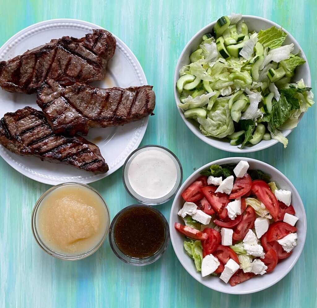 It’s no secret that when my children are with Ted and it’s just ME for mealtime, I’m trying to limit the amount of garlic bread, pizza, spaghetti, and pancakes I consume. For me, I look to the ease and taste of one of my favorite combos: steak and salad. If I’m treating myself to a meal out, then I’m ordering a steak Caesar salad or a wedge salad [extra cheese] with steak. And if I’m home, I’m enjoying one of these steak and salad combinations.